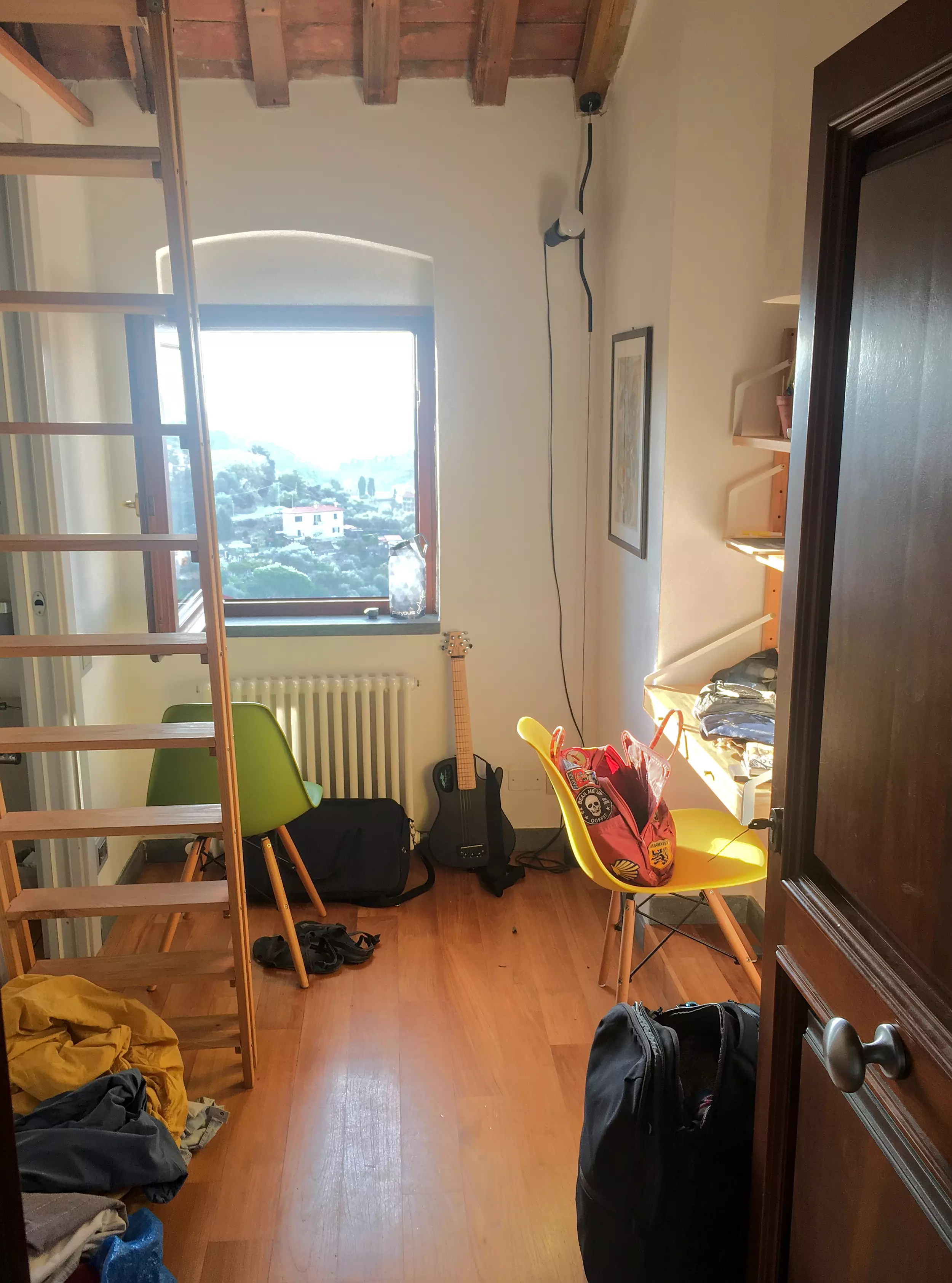 The spare room I am staying in is actually it's own tiny apartment, complete with ensuite and stunning view. The bed is high off the ground, with a rickety wooden stepladder. On my first night I accidentally knocked my phone off the side and completely smashed the screen. After getting it repaired I never risked taking my phone up again.