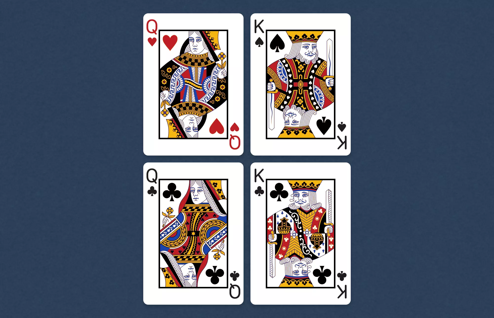Each player is dealt four cards face-down from the card deck. Do not look at these cards! Players arrange their cards in a 2x2 grid in front of them.